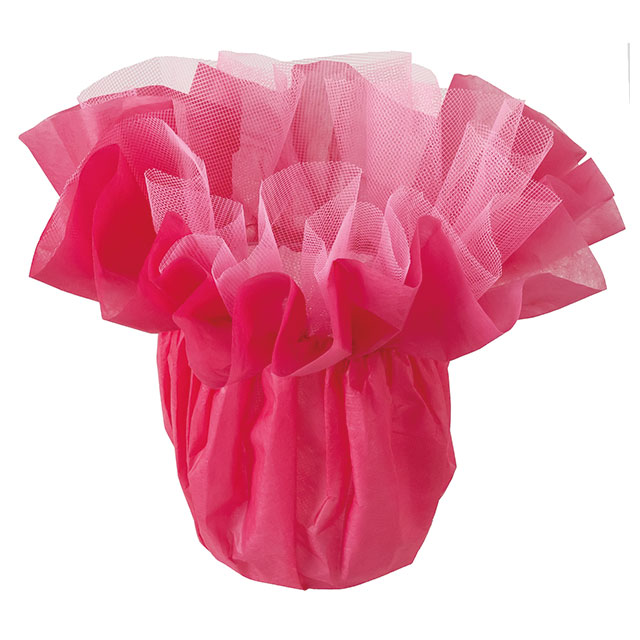 5号苗サイズにおすすめのマゼンタのポットラッピング資材(鉢カバー)です。お花を入れるだけでカンタンに華やかなラッピングが完成!不織布とレースの各層を広げてお好みの形に整えることで更にボリュームたっぷりな仕上がりに。カーネーションやシクラメンなど、様々な苗物をキレイに包めます。内側はビニール加工をしているので、多少の水濡れや土汚れも心配ありません。母の日需要が高まる忙しい時の強い味方!