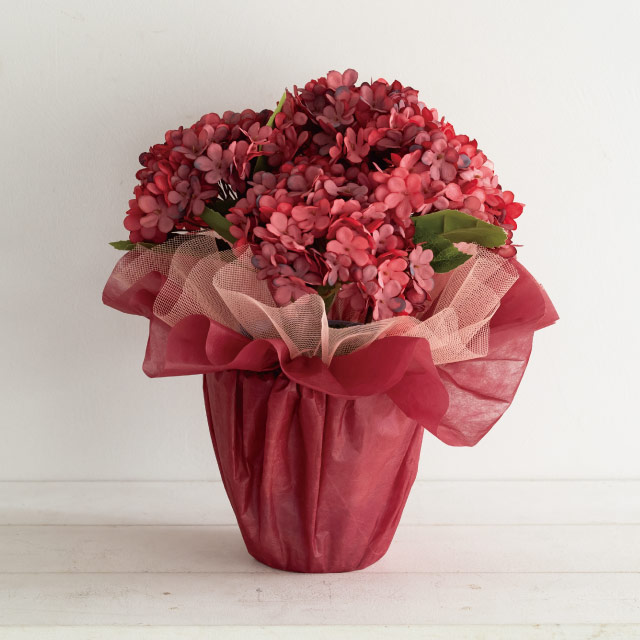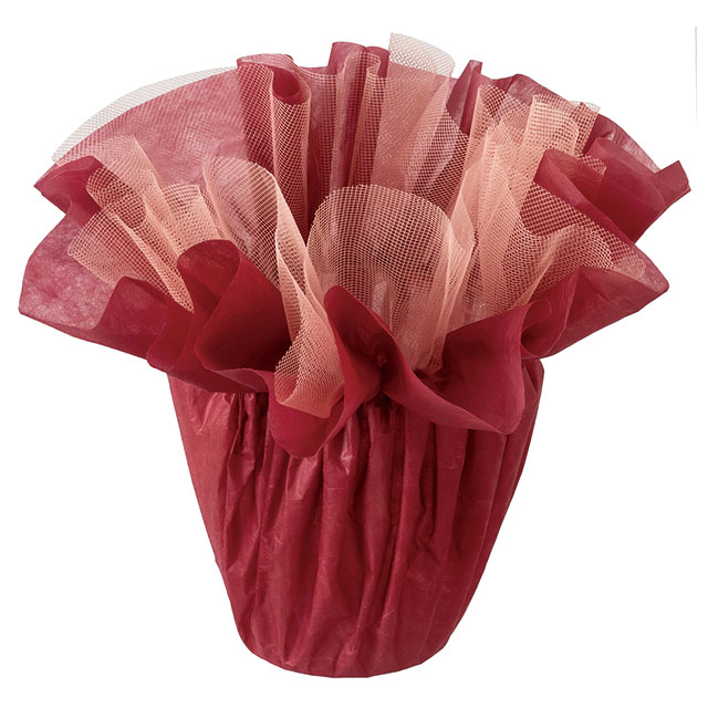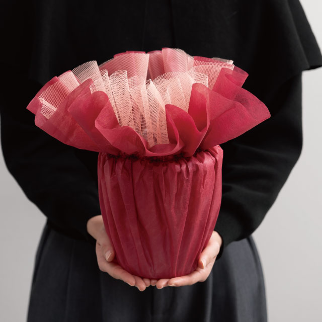 5号苗サイズにおすすめの赤のポットラッピング資材(鉢カバー)です。お花を入れるだけでカンタンに華やかなラッピングが完成!不織布とレースの各層を広げてお好みの形に整えることで更にボリュームたっぷりな仕上がりに。カーネーションやシクラメンなど、様々な苗物をキレイに包めます。内側はビニール加工をしているので、多少の水濡れや土汚れも心配ありません。母の日需要が高まる忙しい時の強い味方!