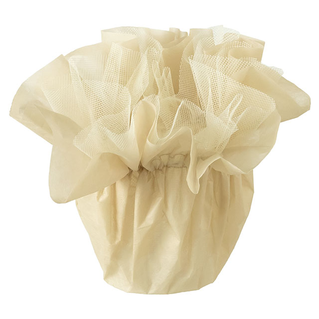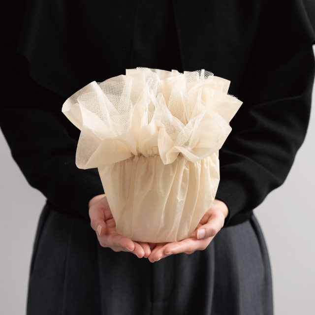 4号苗サイズにおすすめのベージュのポットラッピング資材(鉢カバー)です。お花を入れるだけでカンタンに華やかなラッピングが完成!不織布とレースの各層を広げてお好みの形に整えることで更にボリュームたっぷりな仕上がりに。カーネーションやシクラメンなど、様々な苗物をキレイに包めます。内側はビニール加工をしているので、多少の水濡れや土汚れも心配ありません。母の日需要が高まる忙しい時の強い味方!