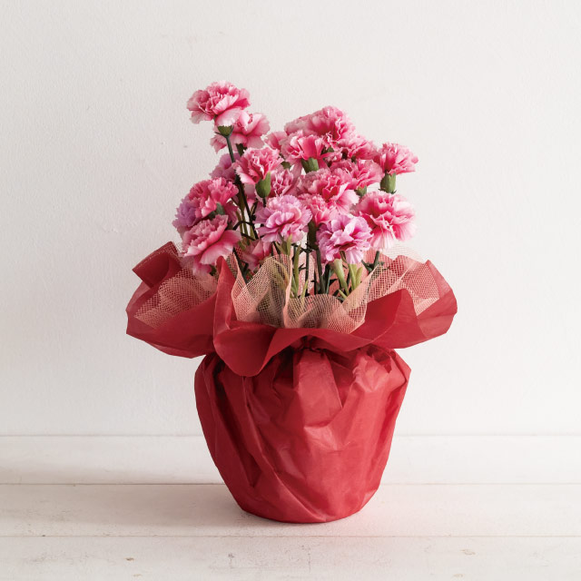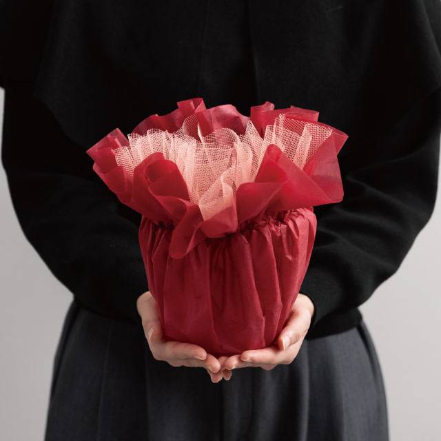 4号苗サイズにおすすめの赤のポットラッピング資材(鉢カバー)です。お花を入れるだけでカンタンに華やかなラッピングが完成!不織布とレースの各層を広げてお好みの形に整えることで更にボリュームたっぷりな仕上がりに。カーネーションやシクラメンなど、様々な苗物をキレイに包めます。内側はビニール加工をしているので、多少の水濡れや土汚れも心配ありません。母の日需要が高まる忙しい時の強い味方!