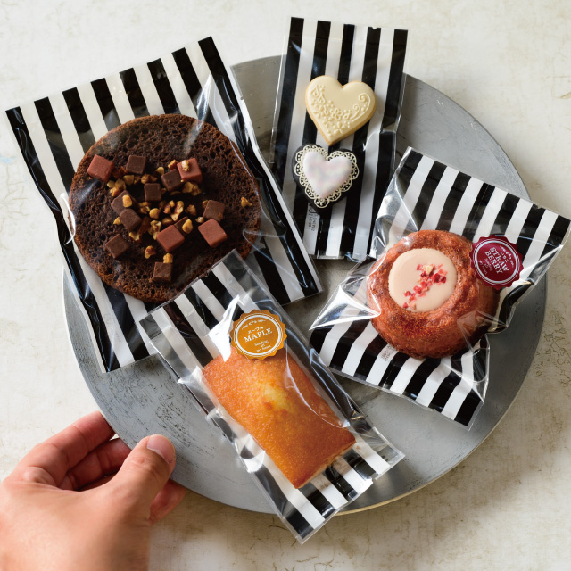 シンプルな白黒ストライプのガス袋(脱酸素剤・乾燥剤対応袋)です。シールを貼ってアレンジすると印象が変わるので、カジュアルギフトから高級感のあるギフトまでお使いいただけます。フィエルテギフトボックスと合わせてお使いいただくのがオススメです。洋菓子はもちろん、和菓子などにも合わせてお使いいただけます。