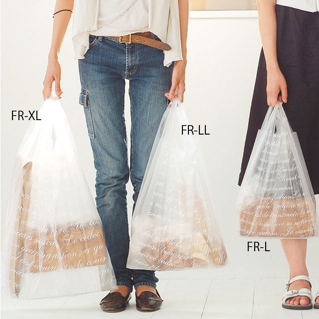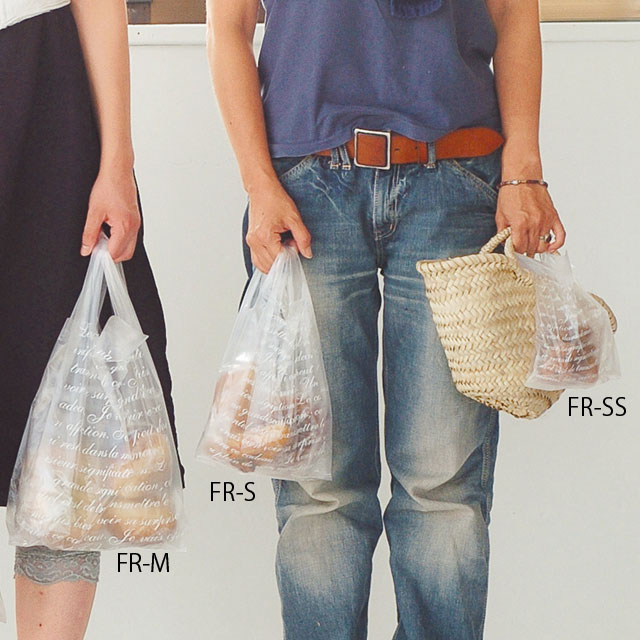 フランス語が並んだ半透明のレジ袋です。お花やフランスパンを入れやすい縦長サイズから、ぬいぐるみや大きな箱などが入るXLサイズまで、豊富なサイズ展開です。通年使えるベーシックなデザインが長く愛されています。