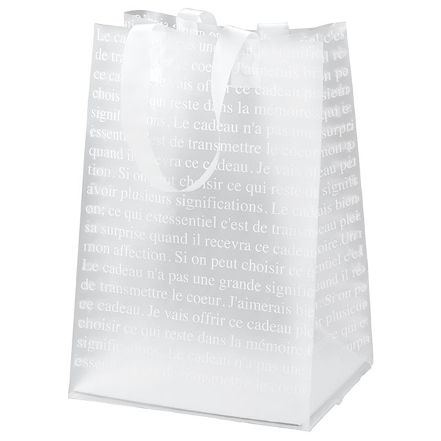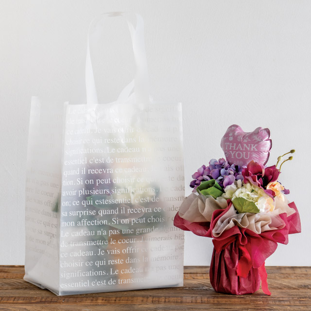 縦長でマチの広い手提げ袋です。中がうっすら透けて見える半透明のPE素材が色とりどりのお花を引き立てます。欧文をあしらったシンプルで使いやすいデザインで、いろんなシーンにお使いいただける手提げ袋です。5号サイズのあじさいや3~4000円程度のブーケがすっぽり収まるサイズです。