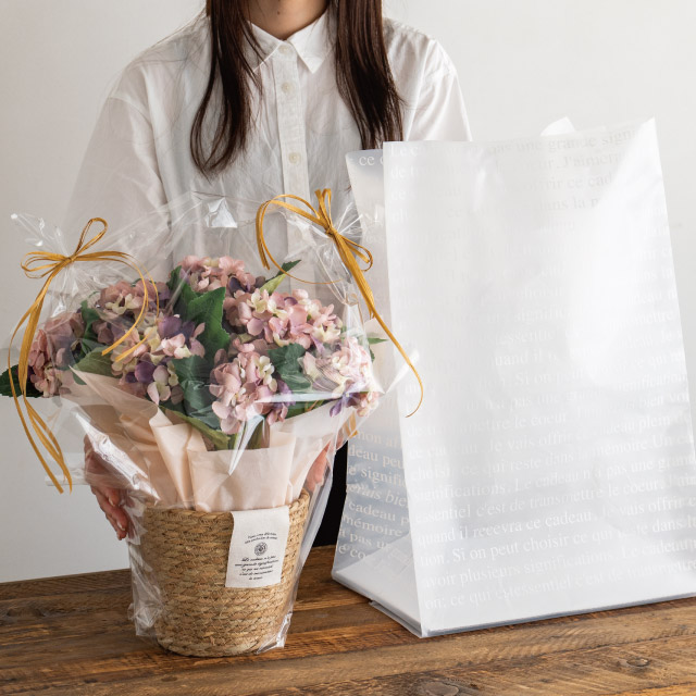 縦長でマチの広い手提げ袋です。中がうっすら透けて見える半透明のPE素材が色とりどりのお花を引き立てます。欧文をあしらったシンプルで使いやすいデザインで、いろんなシーンにお使いいただける手提げ袋です。5号サイズのあじさいや大きめのブーケがすっぽり収まるサイズです