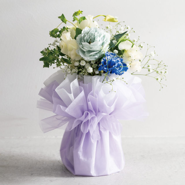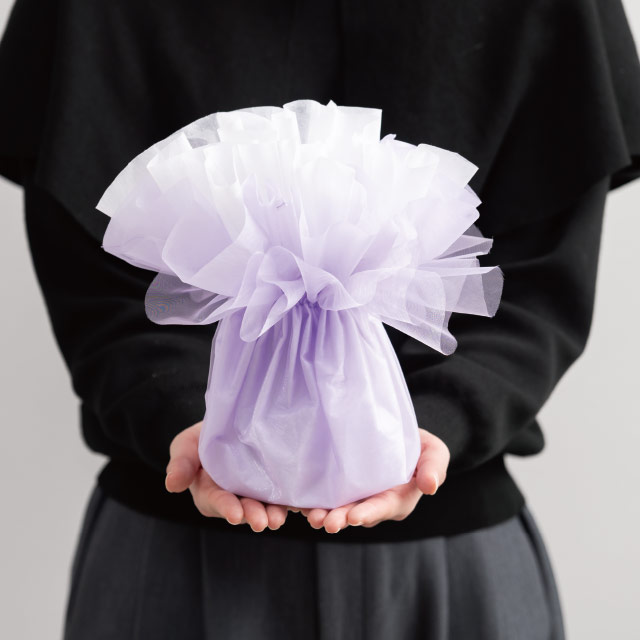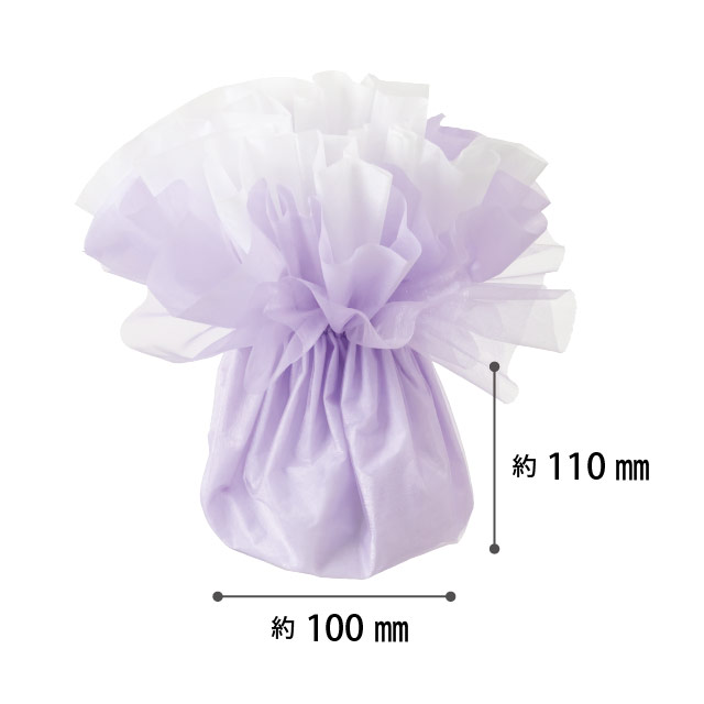 そのまま飾れるスタンディングブーケにおすすめのパープル系のラッピング資材です。不織布とオーガンジーの三層構造になっているので、各層を広げてお好みの形に整えることで更にボリュームたっぷりな仕上がりに。お花を入れるだけでカンタンにおしゃれなスタンディングブーケが完成します。インナーには別売りのブーケスタンド(M-ISD1)がおすすめです。