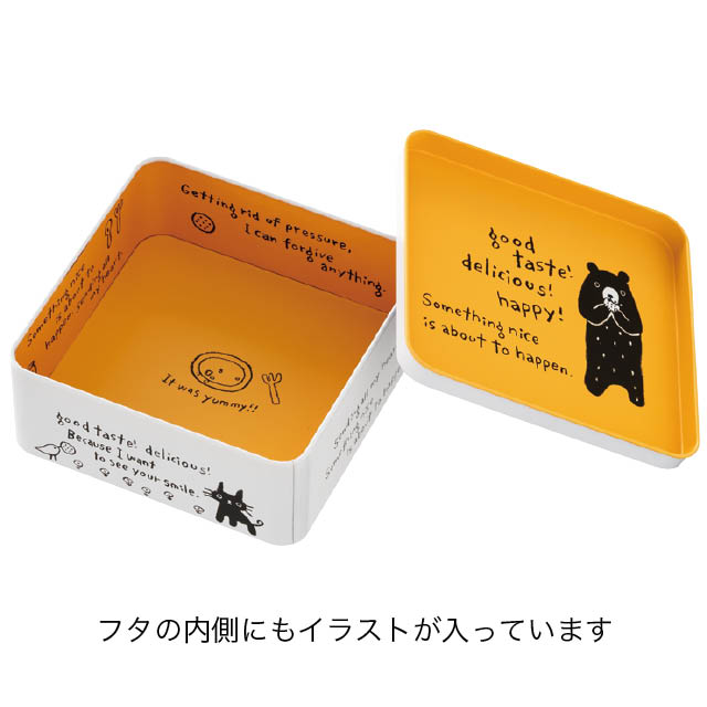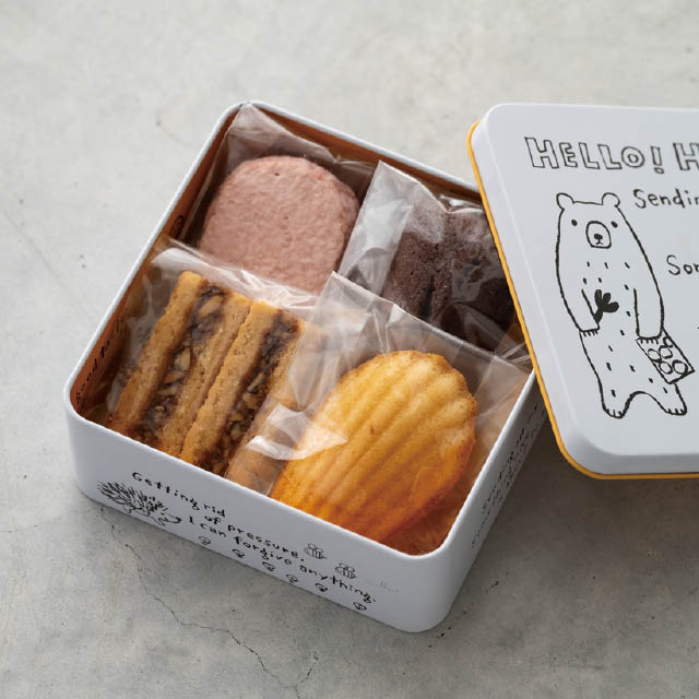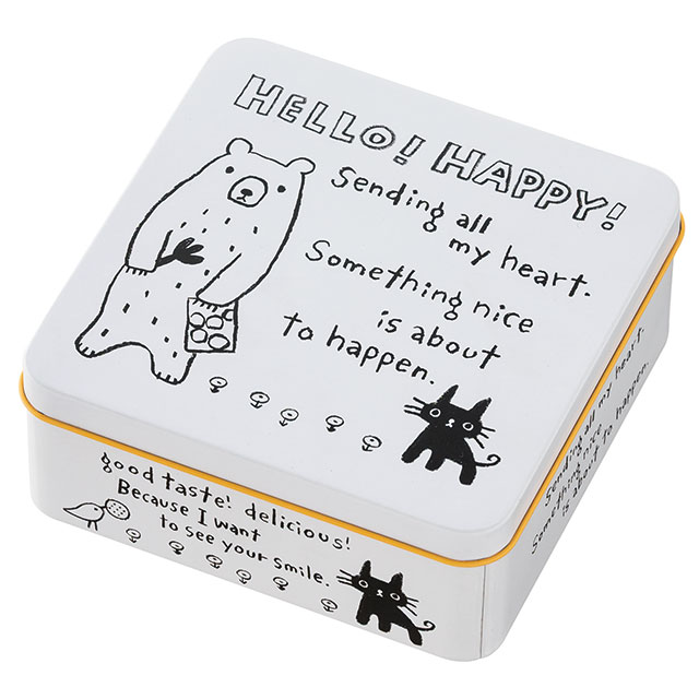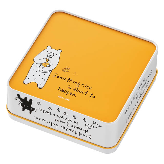 かわいいクマが人気のグラットンベアから正方形の缶が出ました。フタを開けると目に飛び込む内面の鮮やかなイエローがお菓子を華やかに引き立ててくれます。グラットンベアのクッキー型を使用した型抜きクッキーとの相性もばっちり!グラシン紙(M-GLA1)を使用してクッキー缶ギフトにするのもおすすめです。