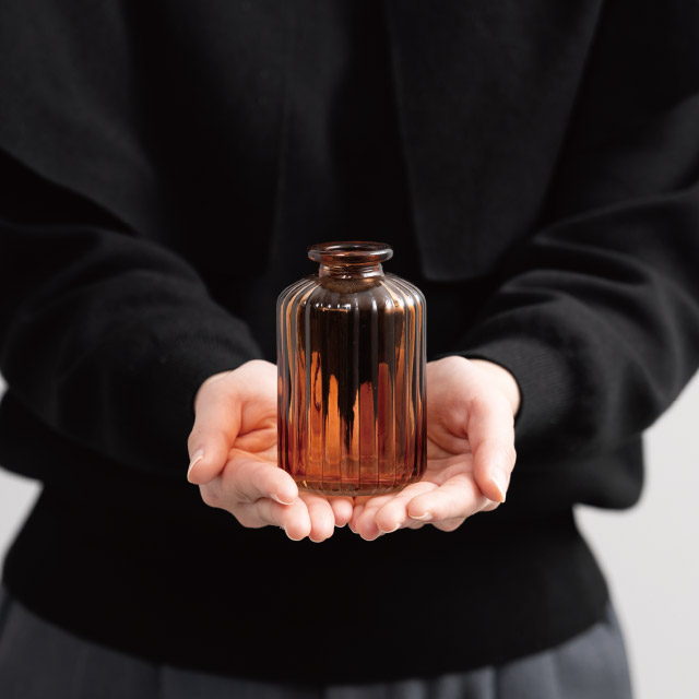 レトロモダンなボトル型と縦ラインがおしゃれなブラウンのフラワーベースです。色ガラス製で中が見えづらいため、お水の汚れも目立ちません。