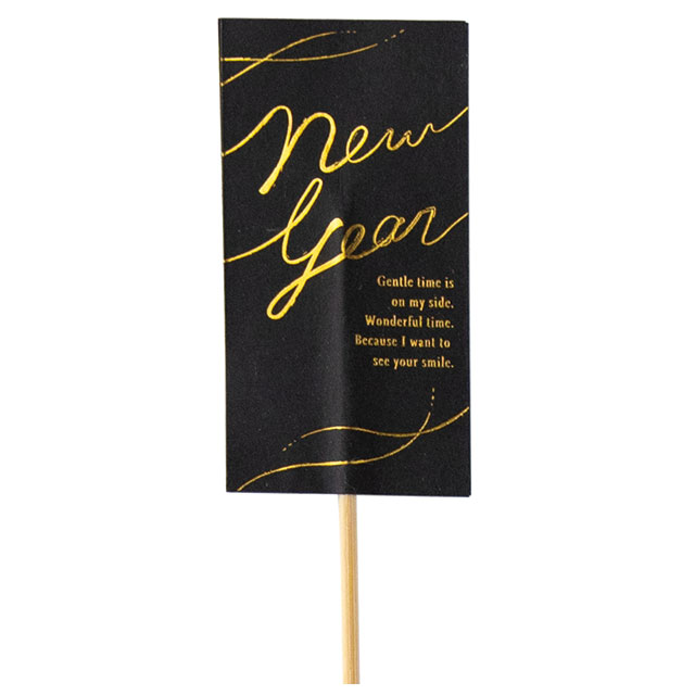 迎春フラワーピックです。黒ベースに「New Year」の金文字が映えるモダンでスタイリッシュなデザインで、洋風のお正月のフラワーアレンジメントにおすすめのフラワーピックです。