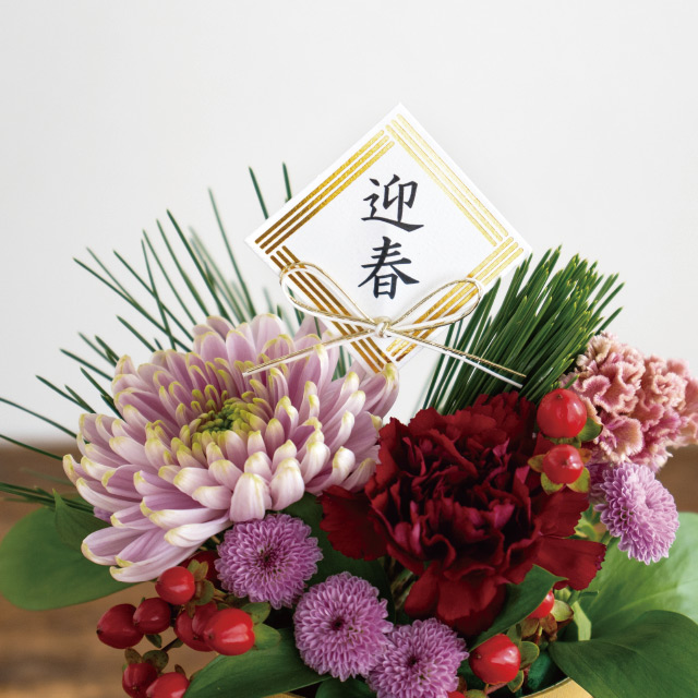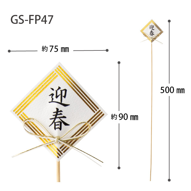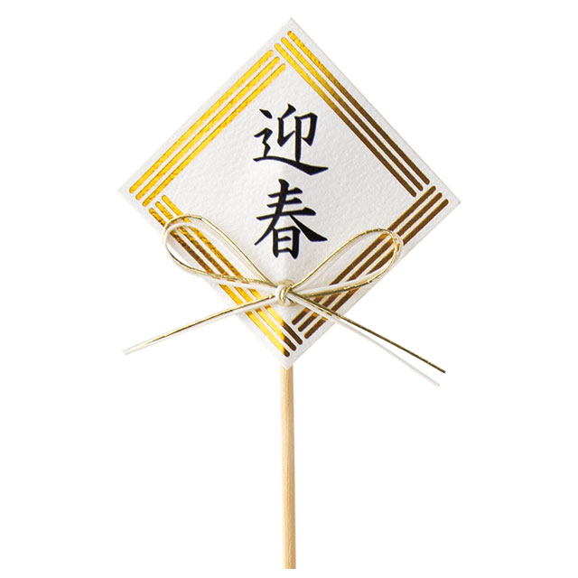 ひし形の迎春フラワーピックです。「迎春」の筆文字を基調にしたシンプルなデザインで、金箔のラインと水引がお正月のフラワーアレンジメントに高級感を添えてくれるフラワーピックです。