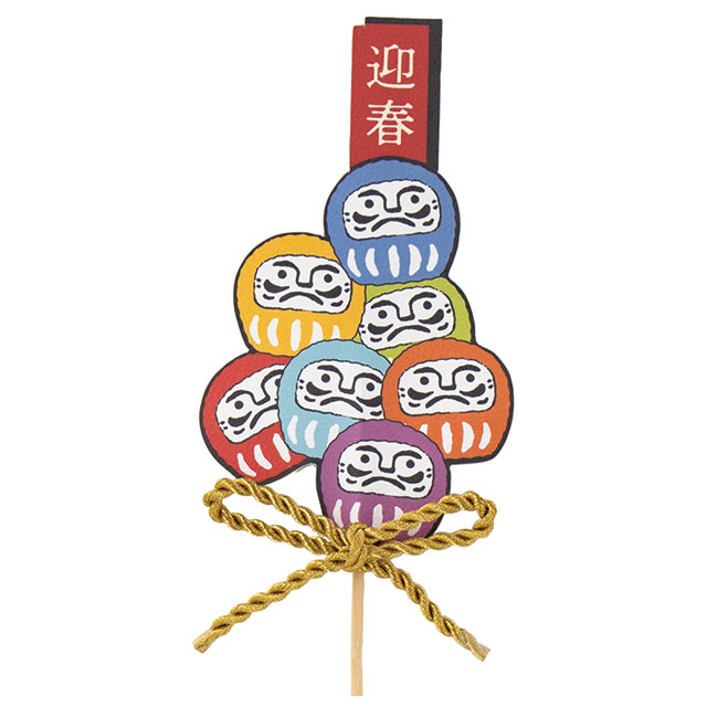 迎春フラワーピックです。カラフルな7色のだるまが積み重なったキュートなデザインと存在感のある大きさで、お正月のフラワーアレンジメントをボリュームアップさせるフラワーピックです。