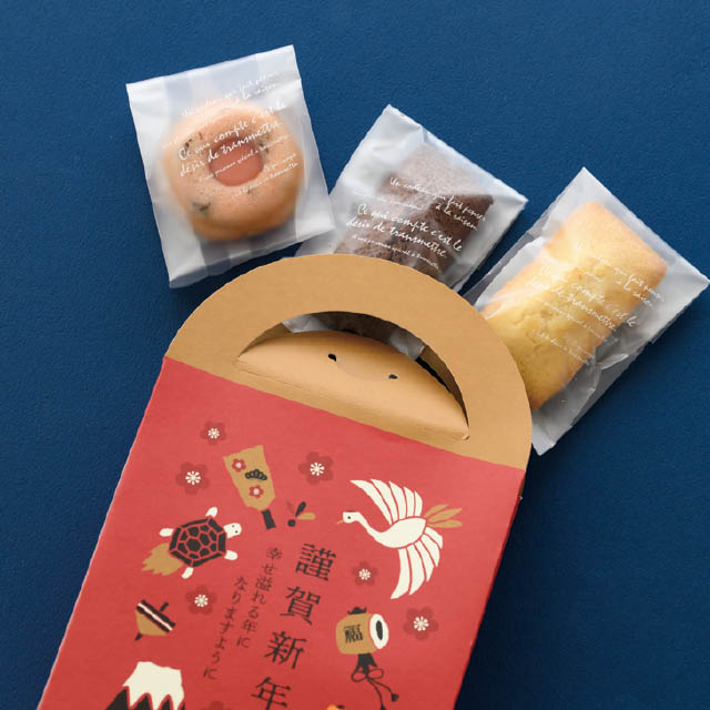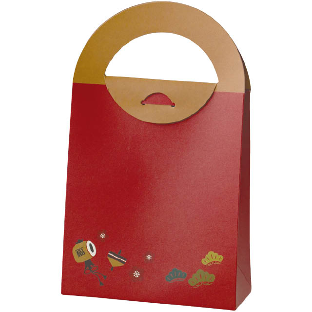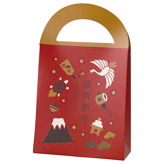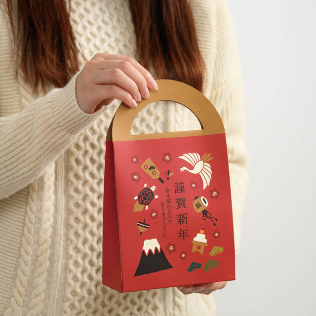 バッグ型の迎春ギフトボックスです。亀や鶴、富士山など縁起のいいデザインでお正月にぴったり!ハンドルが付いているので手に取りやすく、組み立ても簡単にできます。新年のギフトにいかがですか?