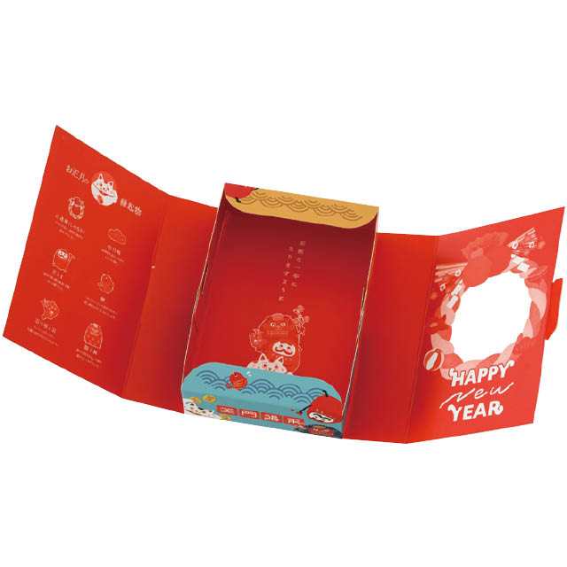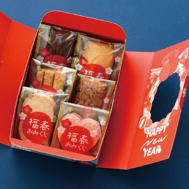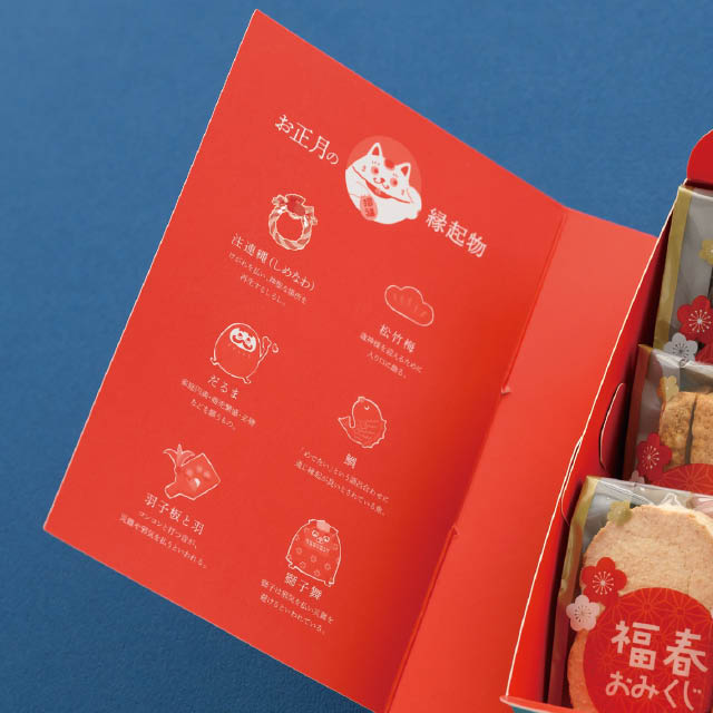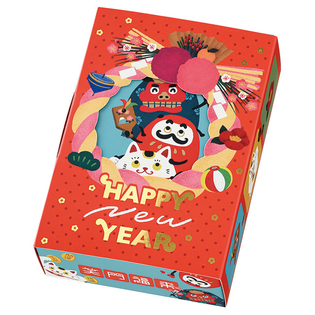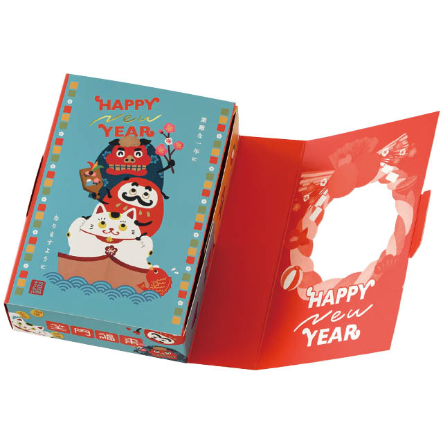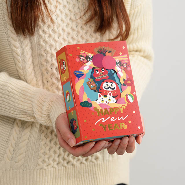 迎春のギフトボックスです。しめ縄の形に切り抜かれた窓から獅子舞たちが顔を出すデザインで、新年のご挨拶ギフトにぴったり!側面や内側にもこだわりのデザイン入り。マドレーヌが6個程度入るほど良いサイズで、お配り用ギフトやお年賀にもおすすめ。たくさん並べると迎春の売り場が一層明るくにぎやかになります。