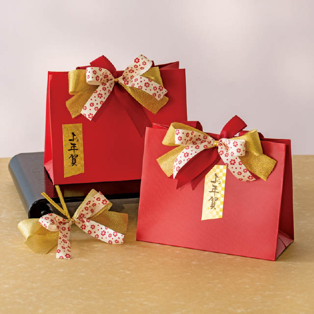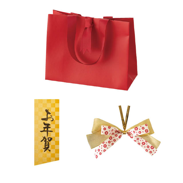イベント資材は余ると困る!そんなお客様のお声から生まれた、迎春ギフトにおすすめのラッピング資材セットです。赤いペーパーバッグにリボンワイヤータイ、シールがセットになったお得なギフトラッピングです。華やかなリボンワイヤータイはこのセットだけの限定品!1回の購入で資材が揃う便利なラッピングセットをぜひお試しください。