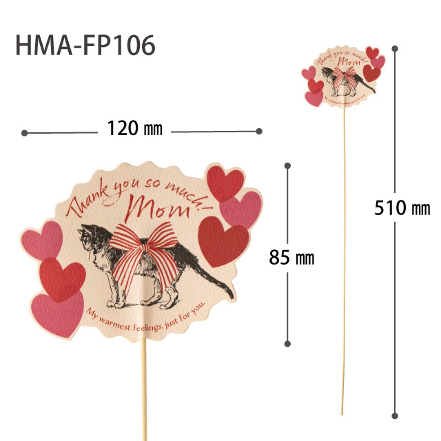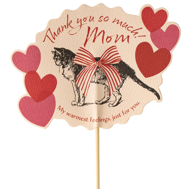 2026年新商品、アンティークなデザインに「Thank you so much! mom」のメッセージ入りの母の日フラワーピックです。ねこやリボン、ハートのデザインがおしゃれで、お花を華やかに彩ります。