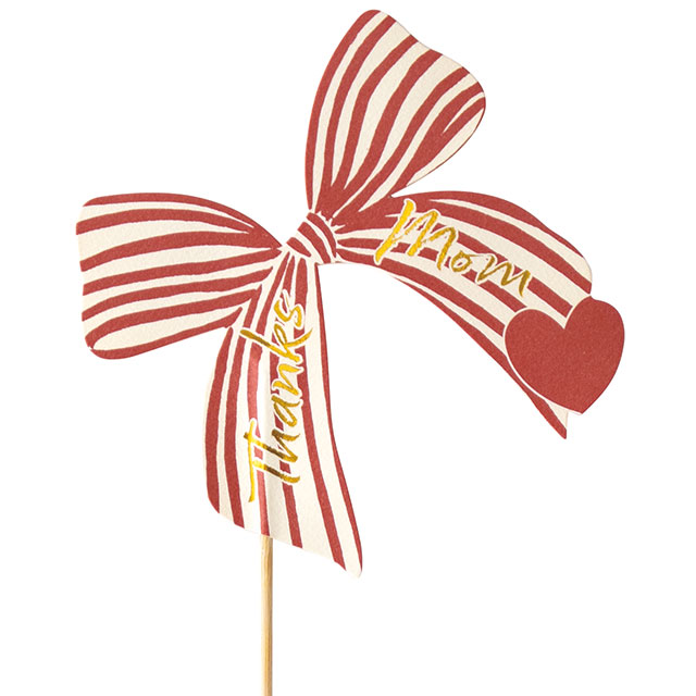2026年新商品、アンティークなデザインに「Thanks mom」のメッセージ入りの母の日フラワーピックです。大きなリボンがおしゃれで、これ一つで目を引く商品に仕上がります。