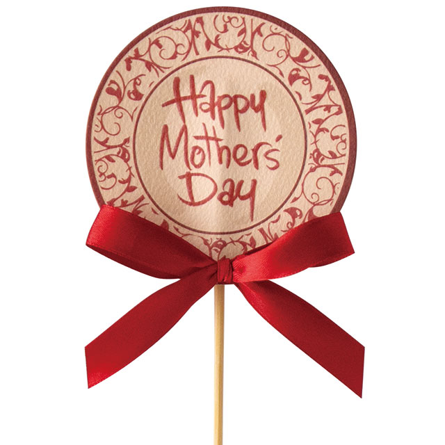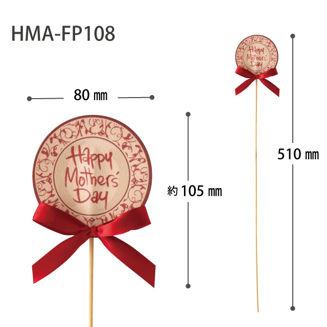 2026年新商品、お皿をイメージした「Happy Mother's Day」のメッセージ入り母の日フラワーピックです。エレガントなツタ柄の丸皿デザインに赤のサテンリボンをあしらいました。スタイリッシュな手書き文字もポイントです。
