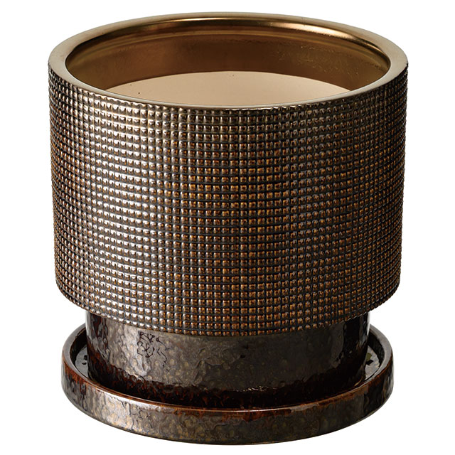 ブラウンカラーの陶器鉢(5号サイズ)です。ほどよい重厚感のあるボディに施した美しく繊細な格子模様が高級感を演出。観葉植物や多肉植物、季節の花をスタイリッシュに引き立てます。受け皿付きで水やりの管理も簡単。ギフト用や定番のグリーンアレンジにも幅広く活用できる陶器鉢です。