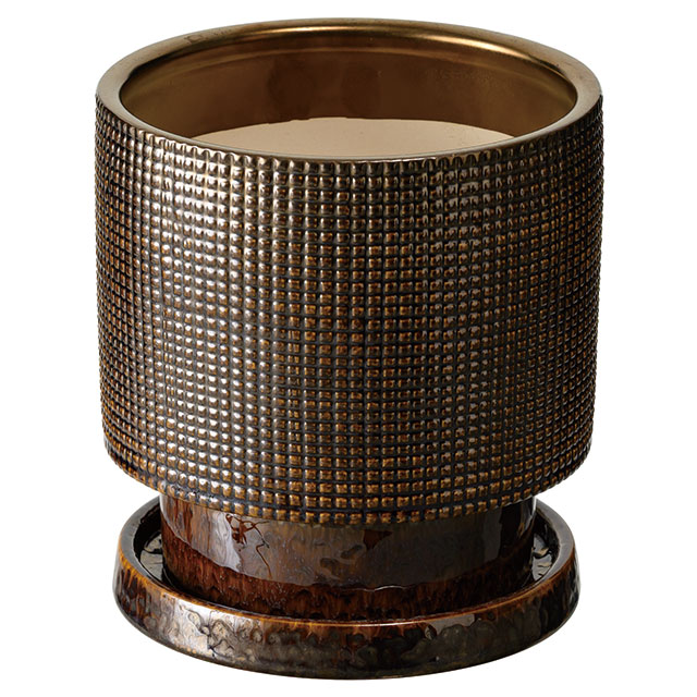 ブラウンカラーの陶器鉢(4号サイズ)です。ほどよい重厚感のあるボディに施した美しく繊細な格子模様が高級感を演出。観葉植物や多肉植物、季節の花をスタイリッシュに引き立てます。受け皿付きで水やりの管理も簡単。ギフト用や定番のグリーンアレンジにも幅広く活用できる陶器鉢です。