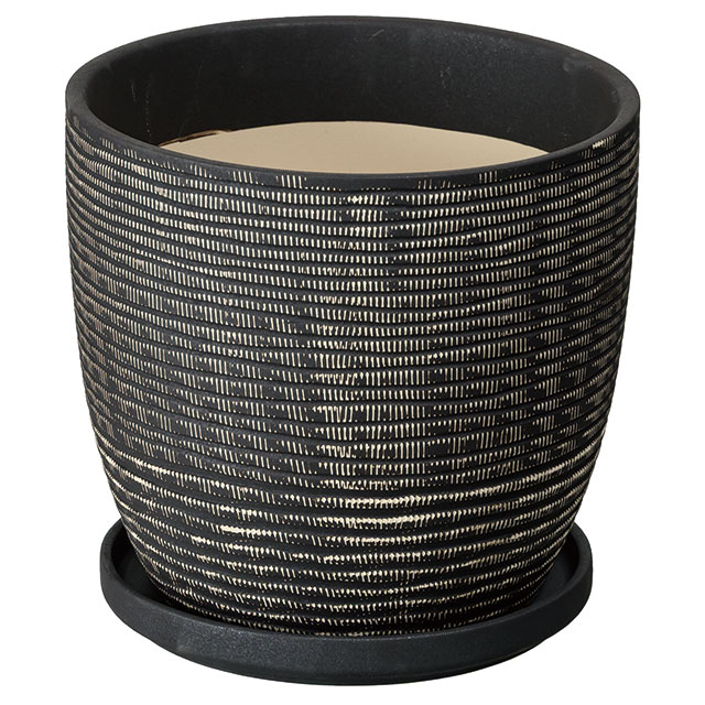 シックなブラックカラーの陶器鉢(5号サイズ)です。立体感のある編み込みデザインと洗練されたフォルムが、観葉植物や季節の花をスタイリッシュに引き立て、お部屋や玄関、店舗ディスプレイなど、さまざまな空間を上品に演出します。受け皿付きで水やりの管理も簡単。ギフト用や定番のグリーンアレンジにも幅広く活用できる陶器鉢です。