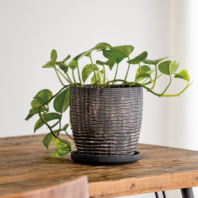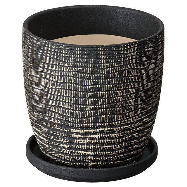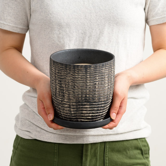 シックなブラックカラーの陶器鉢(4号サイズ)です。立体感のある編み込みデザインと洗練されたフォルムが、観葉植物や季節の花をスタイリッシュに引き立て、お部屋や玄関、店舗ディスプレイなど、さまざまな空間を上品に演出します。受け皿付きで水やりの管理も簡単。ギフト用や定番のグリーンアレンジにも幅広く活用できる陶器鉢です。