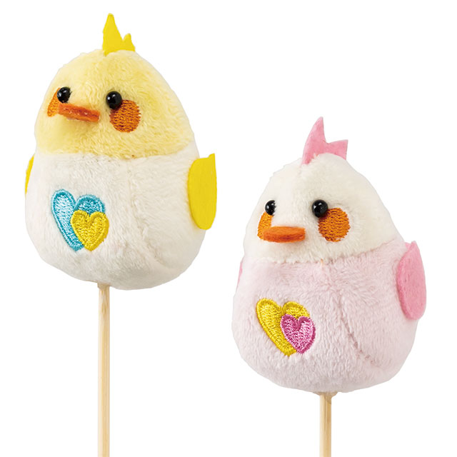 オカメインコ風のトリのマスコットフラワーピック(2色アソート)です。コロンとしたフォルムとキュートで愛嬌たっぷりの表情がお客様の目をひくフラワーピックです。