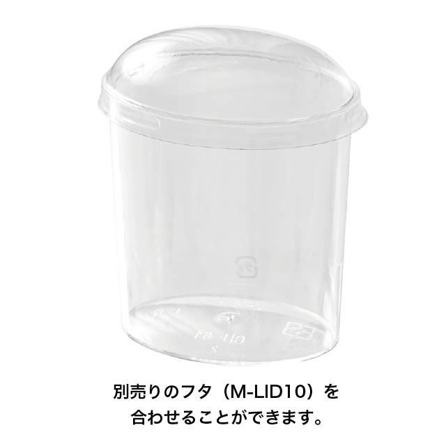 クリアな楕円型デザートカップです。透明なのでスイーツの断面を見せることができ、ムースやゼリーはもちろんティラミスなどにもおすすめです。カップスイーツをお店のショーケースに並べてみませんか?カップにぴったり合うフタ(M-LID10)もご用意しております。