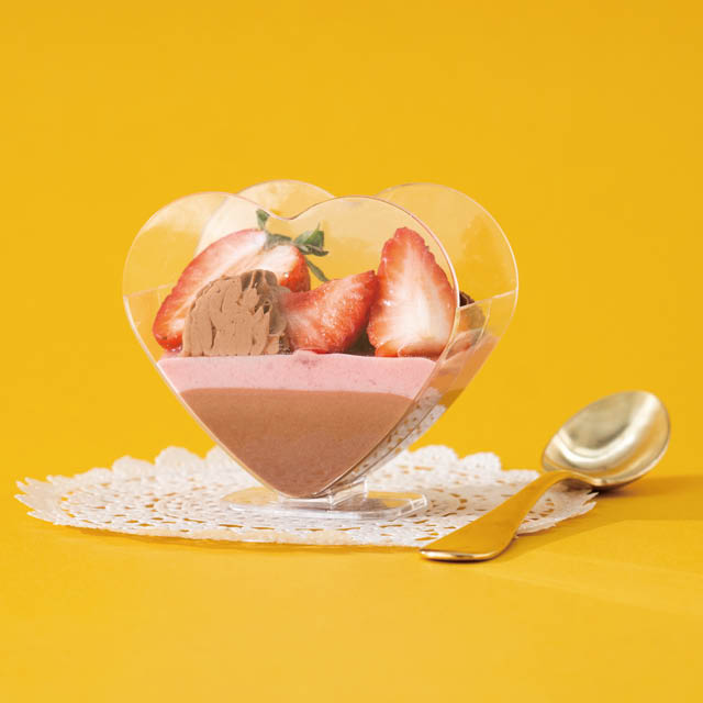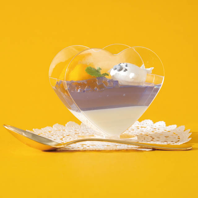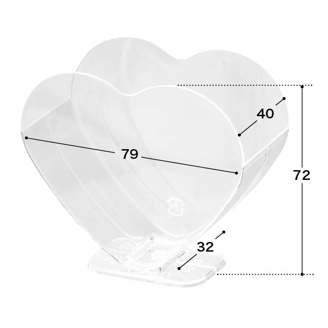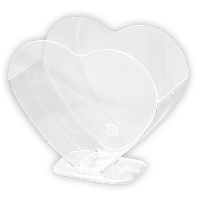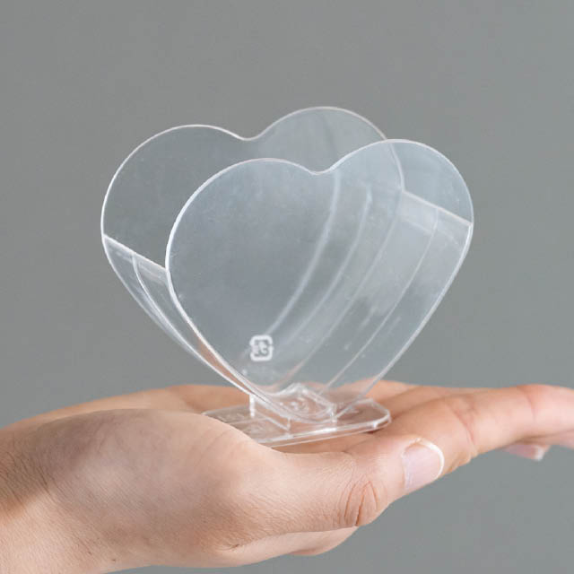 クリアなハート型デザートカップです。透明なのでスイーツの断面を見せることができ、ムースやゼリーはもちろんティラミスなどにもおすすめです。カップスイーツをお店のショーケースに並べてみませんか?
