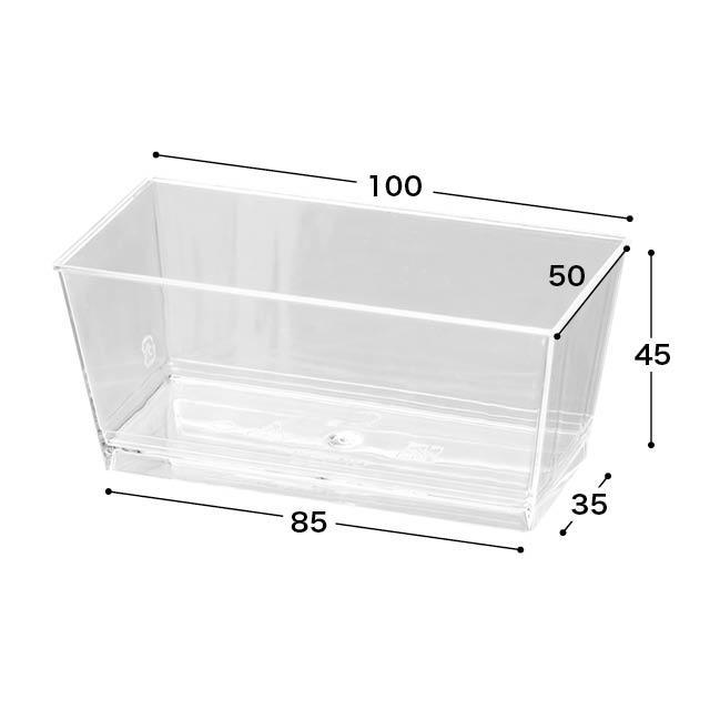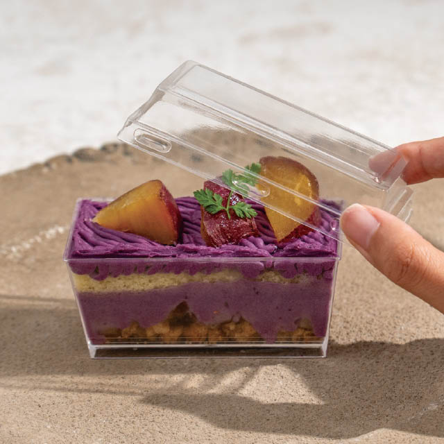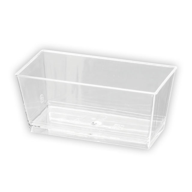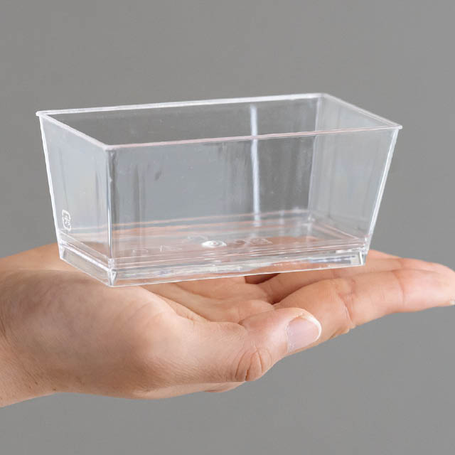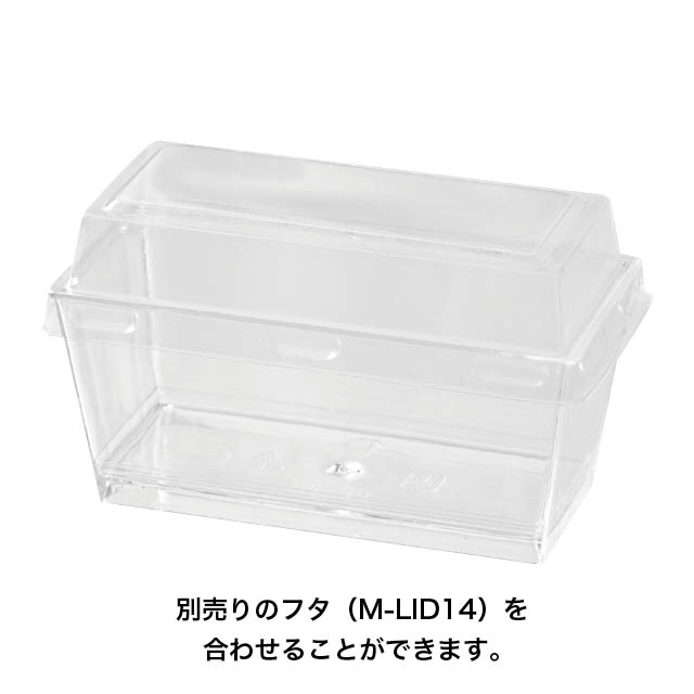 クリアな長方形のデザートカップです。透明なのでスイーツの断面を見せることができ、ムースやゼリーはもちろんティラミスなどにもおすすめです。カップスイーツをお店のショーケースに並べてみませんか?カップにぴったり合うフタ(M-LID14)もご用意しております。