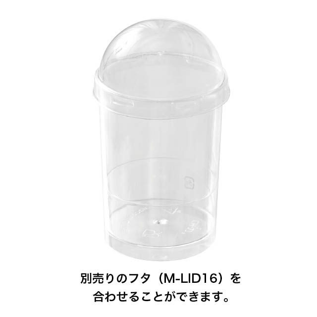 クリアな円柱型デザートカップです。透明なのでスイーツの断面を見せることができ、ムースやゼリーはもちろんティラミスなどにもおすすめです。カップスイーツをお店のショーケースに並べてみませんか?カップにぴったり合うフタ(M-LID16)もご用意しております。
