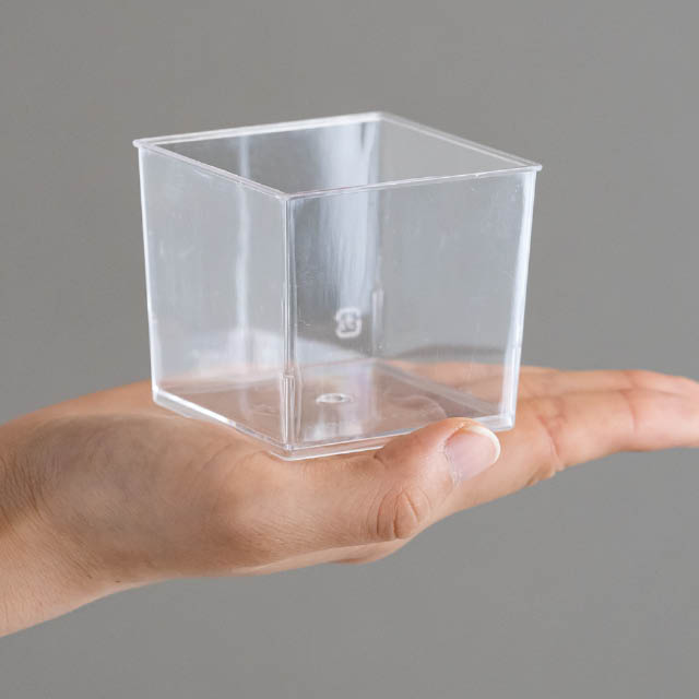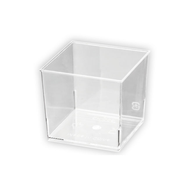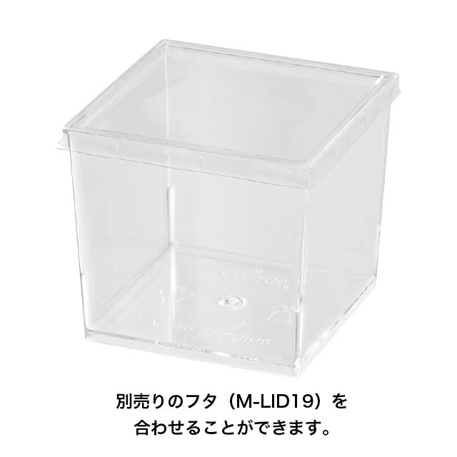 クリアな四角形のデザートカップです。透明なのでスイーツの断面を見せることができ、ムースやゼリーはもちろんティラミスなどにもおすすめです。カップスイーツをお店のショーケースに並べてみませんか?カップにぴったり合うフタ(M-LID19)もご用意しております。