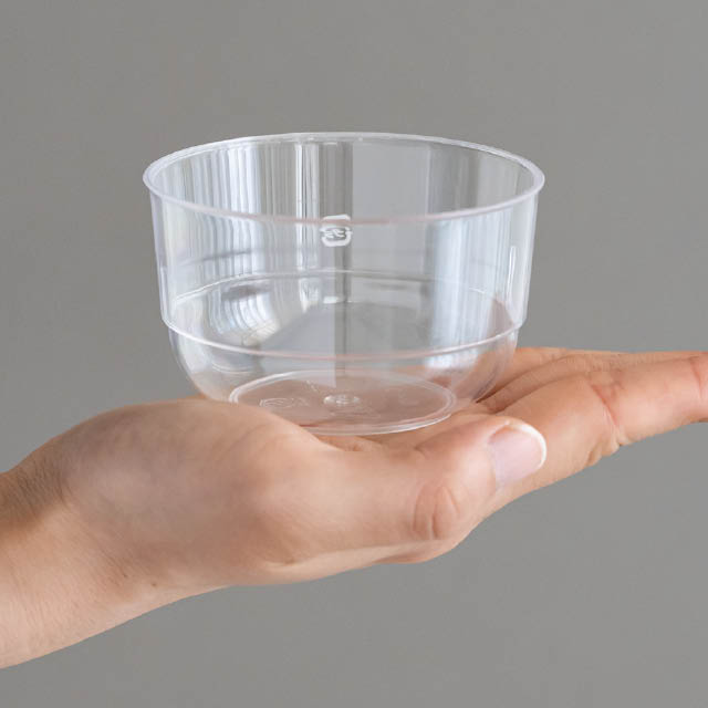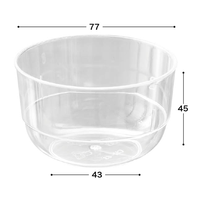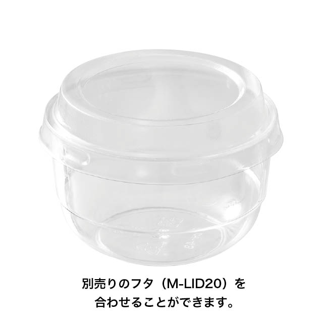 クリアな丸型デザートカップです。透明なのでスイーツの断面を見せることができ、ムースやゼリーはもちろんティラミスなどにもおすすめです。カップスイーツをお店のショーケースに並べてみませんか?カップにぴったり合うフタ(M-LID20)もご用意しております。