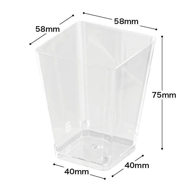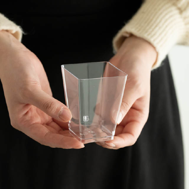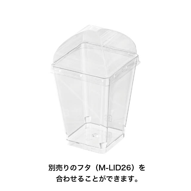 クリアな四角形のデザートカップです。透明なのでスイーツの断面を見せることができ、ムースやゼリーはもちろんティラミスなどにもおすすめです。更に100個入りの小ロットなのに価格もリーズナブル!お試しやストックのしやすさも魅力です。カップスイーツをお店のショーケースに並べてみませんか?カップにぴったり合うフタ(M-LID26)もご用意しております。