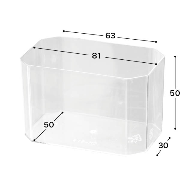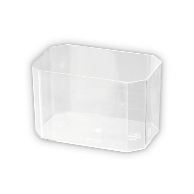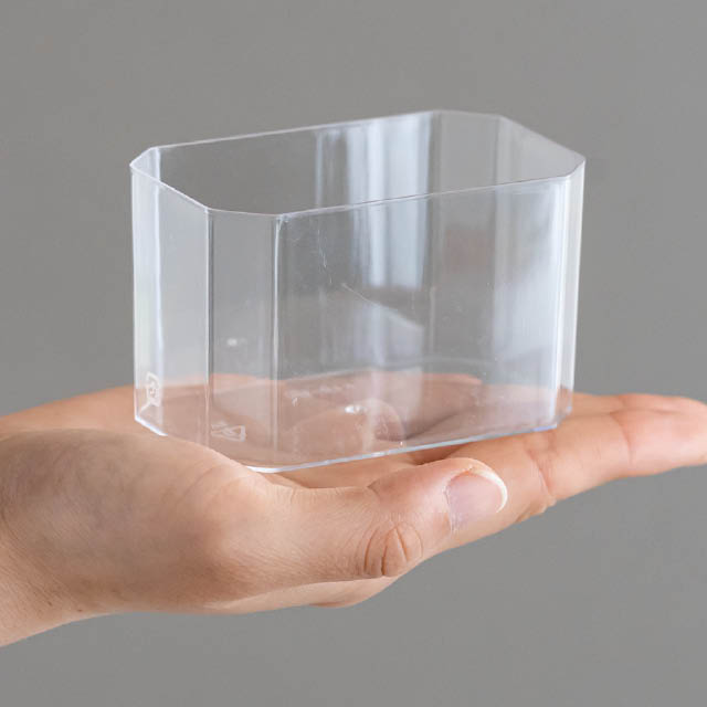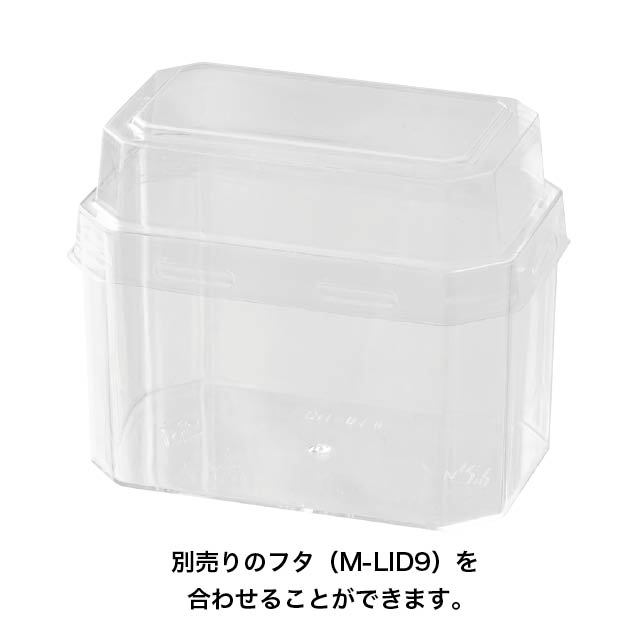 クリアな長方形のデザートカップです。透明なのでスイーツの断面を見せることができ、ムースやゼリーはもちろんティラミスなどにもおすすめです。カップスイーツをお店のショーケースに並べてみませんか?カップにぴったり合うフタ(M-LID9)もご用意しております。