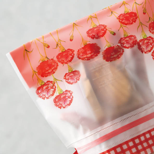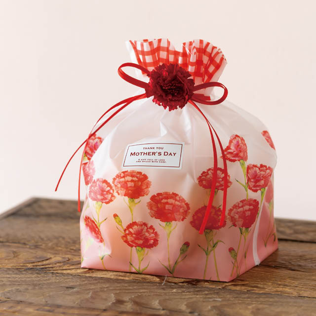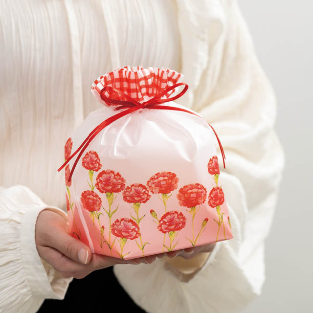 ほんのり透ける素材がオシャレなカーネーション柄の母の日リボン付巾着バッグです。カーネーションの花と赤の格子デザイン、2本使いの細い赤のサテンリボンが可愛らしさに繊細な印象を添えています。 焼き菓子が6つ程度入るほどよいサイズ感で、お菓子を詰め合わせた母の日のプチギフトにぴったりのラッピング袋です。