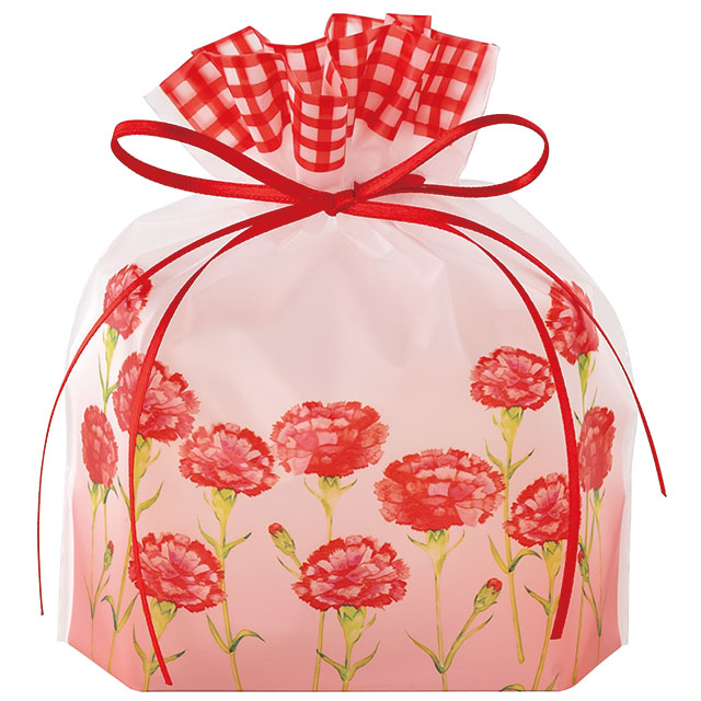 ほんのり透ける素材がオシャレなカーネーション柄の母の日リボン付巾着バッグです。カーネーションの花と赤の格子デザイン、2本使いの細い赤のサテンリボンが可愛らしさに繊細な印象を添えています。 焼き菓子が4つ程度入るほどよいサイズ感で、お菓子を詰め合わせた母の日のプチギフトにぴったりのラッピング袋です。