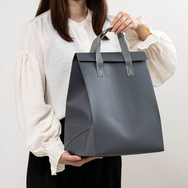 チャコールグレーの無地保冷バッグです。低単価&飽きの来ないシンプルなデザイン、マジックテープ付きで開閉も簡単。コンパクトに折りたたむことができるので保管時もかさばらず、店舗の収納スペースを圧迫しません。デイリー資材として使いやすさへのこだわりを詰め込んだ保冷バッグです。リユース可能なエコロジーさも魅力。マチ広でお惣菜パックを傾けずに平らに入れられるので、お惣菜や冷凍・冷蔵品の持ち帰り用としてスーパーやお土産屋さん、道の駅など、様々な店舗におすすめです。