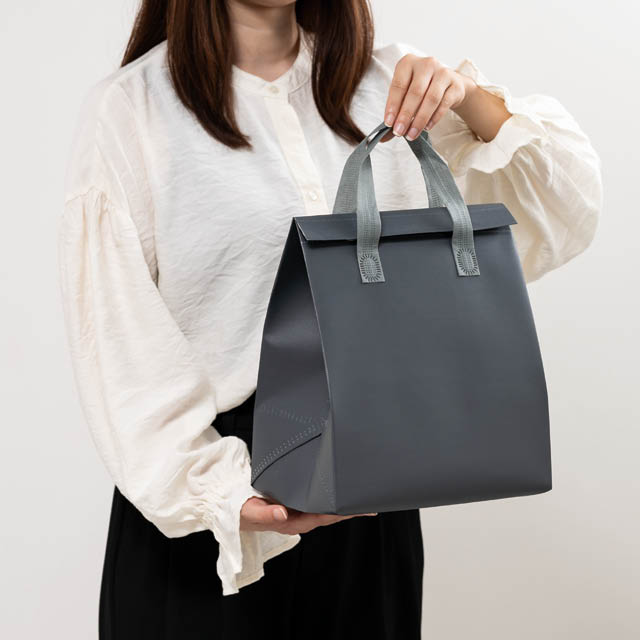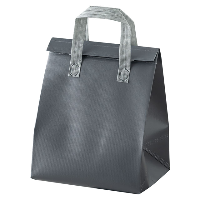 チャコールグレーの無地保冷バッグです。低単価&飽きの来ないシンプルなデザイン、マジックテープ付きで開閉も簡単。コンパクトに折りたたむことができるので保管時もかさばらず、店舗の収納スペースを圧迫しません。デイリー資材として使いやすさへのこだわりを詰め込んだ保冷バッグです。リユース可能なエコロジーさも魅力。マチ広でお惣菜パックを傾けずに平らに入れられるので、お惣菜や冷凍・冷蔵品の持ち帰り用としてスーパーやお土産屋さん、道の駅など、様々な店舗におすすめです。