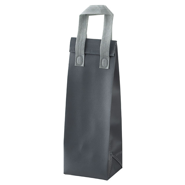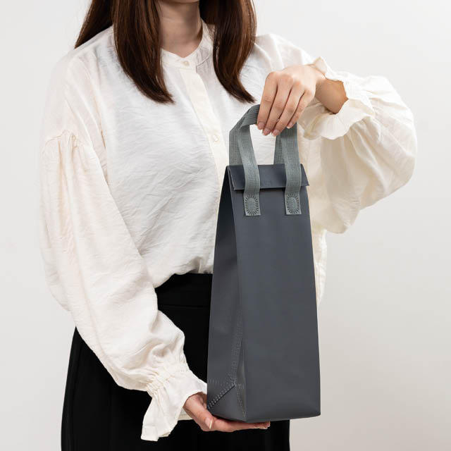 チャコールグレーのボトル用の無地保冷バッグです。低単価&飽きの来ないシンプルなデザイン、マジックテープ付きで開閉も簡単。コンパクトに折りたたむことができるので保管時もかさばらず、店舗の収納スペースを圧迫しません。デイリー資材として使いやすさへのこだわりを詰め込んだ保冷バッグです。リユース可能なエコロジーさも魅力。