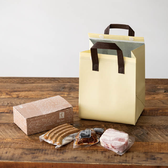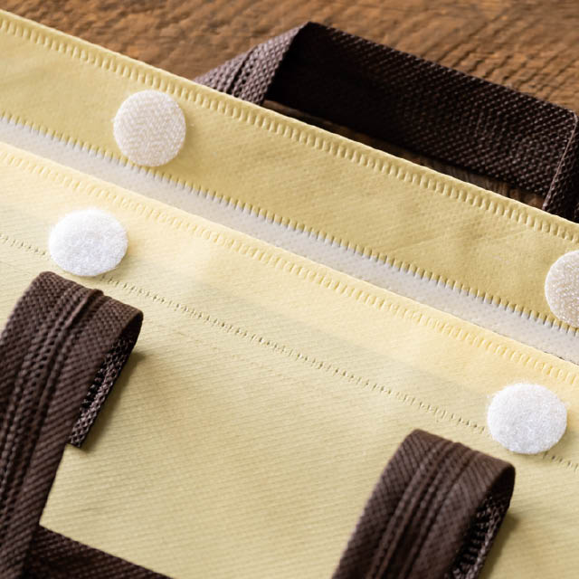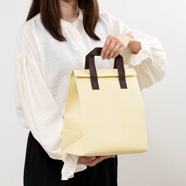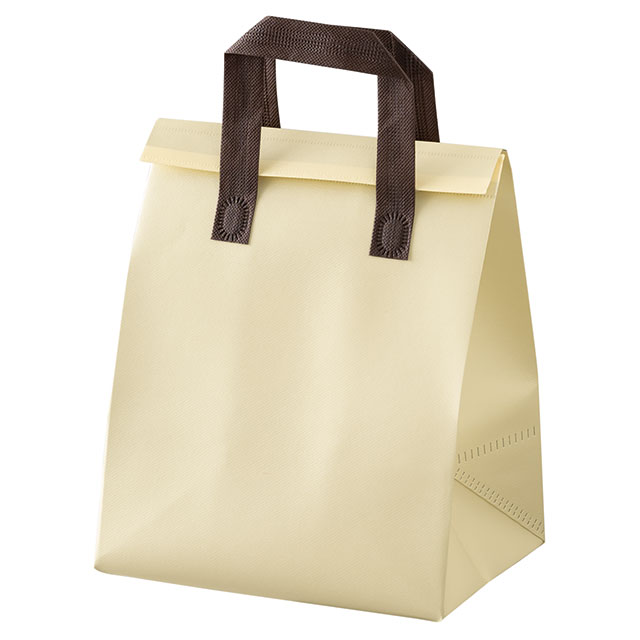 クリーム色の無地保冷バッグです。低単価&飽きの来ないシンプルなデザイン、マジックテープ付きで開閉も簡単。コンパクトに折りたたむことができるので保管時もかさばらず、店舗の収納スペースを圧迫しません。デイリー資材として使いやすさへのこだわりを詰め込んだ保冷バッグです。リユース可能なエコロジーさも魅力。マチ広でお惣菜パックを傾けずに平らに入れられるので、お惣菜や冷凍・冷蔵品の持ち帰り用としてスーパーやお土産屋さん、道の駅など、様々な店舗におすすめです。