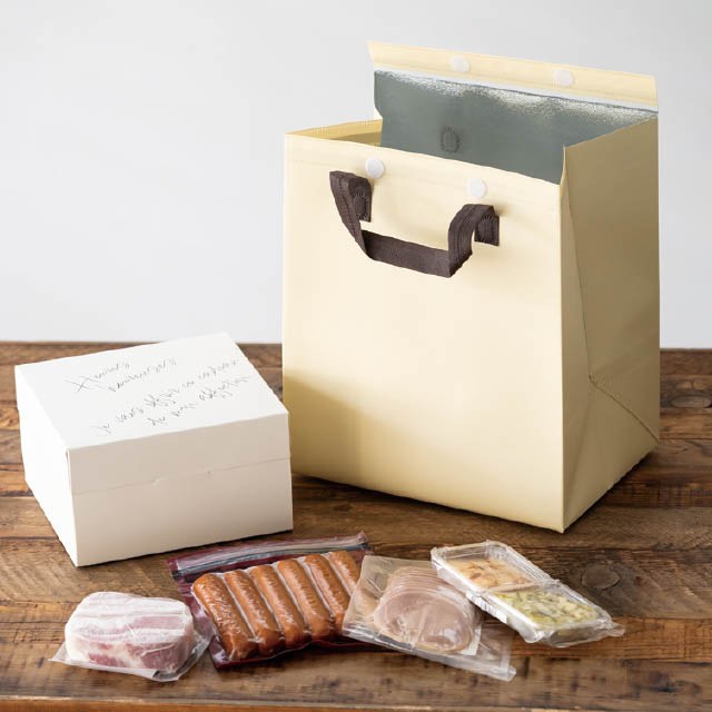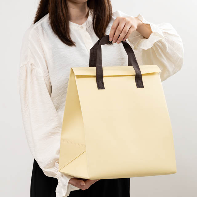 クリーム色の無地保冷バッグです。低単価&飽きの来ないシンプルなデザイン、マジックテープ付きで開閉も簡単。コンパクトに折りたたむことができるので保管時もかさばらず、店舗の収納スペースを圧迫しません。デイリー資材として使いやすさへのこだわりを詰め込んだ保冷バッグです。リユース可能なエコロジーさも魅力。マチ広でお肉のパックを傾けずに平らに入れられるので、お惣菜や冷凍・冷蔵品の持ち帰り用としてスーパーやお土産屋さん、道の駅など、様々な店舗におすすめです。