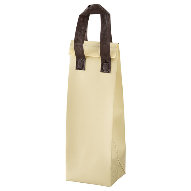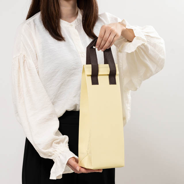 クリーム色のボトル用の無地保冷バッグです。低単価&飽きの来ないシンプルなデザイン、マジックテープ付きで開閉も簡単。コンパクトに折りたたむことができるので保管時もかさばらず、店舗の収納スペースを圧迫しません。デイリー資材として使いやすさへのこだわりを詰め込んだ保冷バッグです。リユース可能なエコロジーさも魅力。