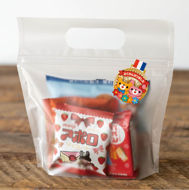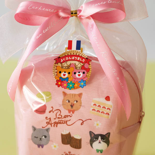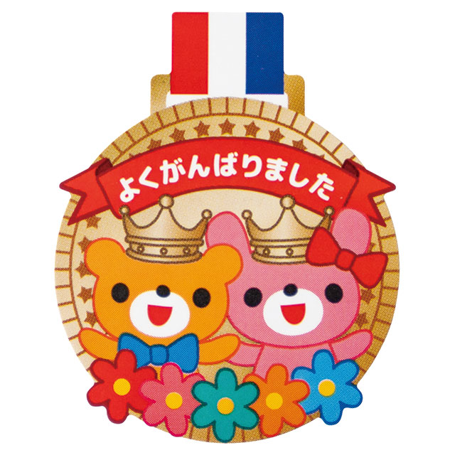メダルデザインのギフトシール(強粘着)です。くまとうさぎのイラストに「よくがんばりました」のメッセージをあしらった可愛いデザインで、運動会や子供会などの学校行事や、合格祝いなどにぴったり。お配り用のプチギフトにもおすすめのギフトシールです。強粘着シールなので、梨地バッグなどのマット素材にもお使いいただけます。
