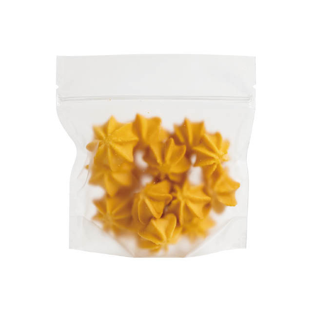 マットタイプの無地スタンドバッグ(乾燥剤・脱酸素剤対応ガス袋)です。横広タイプで封入口を大きくしたため、焼菓子を詰めやすく、また消費者の方が食べやすくなるよう工夫しました。開閉に便利なジップ付きで使いやすく、高級感のある無地のマットタイプなので、テイスティシールはもちろん、お店のシールやリボンでオリジナル資材のようにお使いいただける便利な個包装ガス袋です。