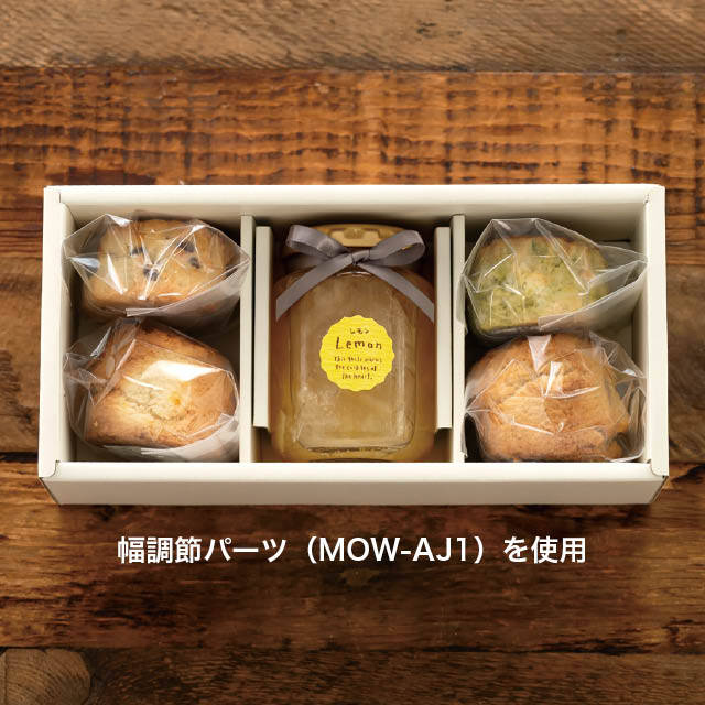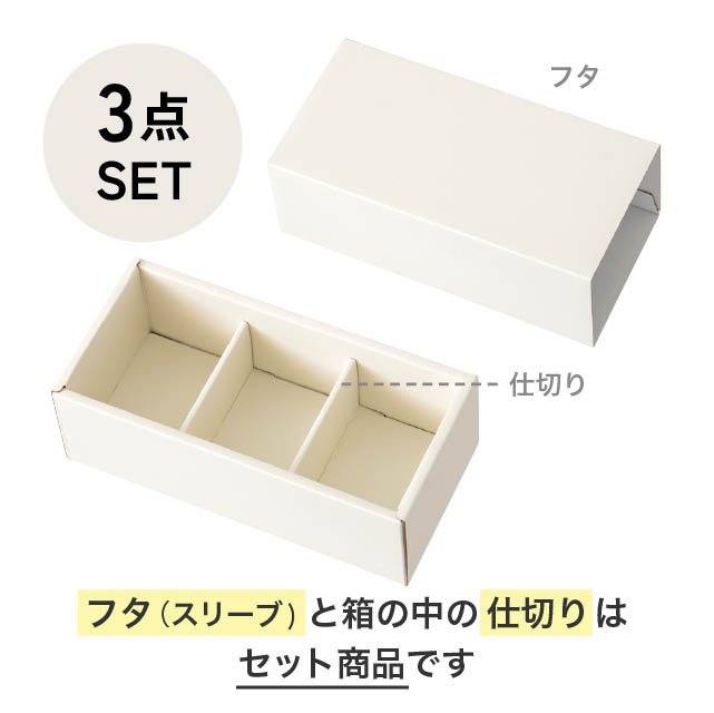 ジャムや惣菜などの瓶が3つ入る仕切りが付いたオフホワイトのスリーブボックスです。セットの仕切りは横に倒してマスを拡張してお使いいただくことも可能です。別売りの調節パーツを使うことで、様々なサイズの瓶に対応できる便利なギフトボックスです。