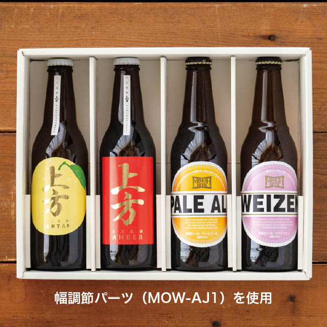 ジャムや惣菜などの瓶が8つ入る仕切りが付いたオフホワイトのスリーブボックスです。セットの仕切りは縦横共に倒してマスを拡張できるので、クラフトビールなどのボトルを入れてお使いいただくことも可能です。別売りの調節パーツを使うことで、様々なサイズの瓶に対応できる便利なギフトボックスです。