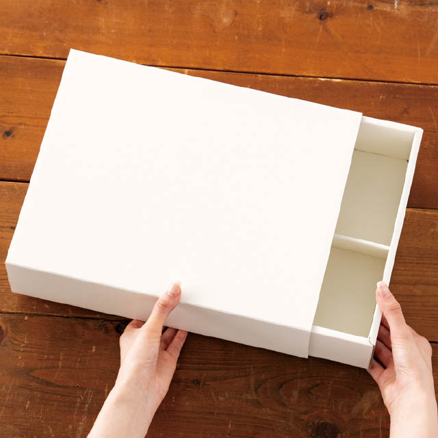 スリーブ式なので身フタに段差が少なく包装紙もキレイに包むことができ、省スペースでギフト見本を展示できるのもポイントです。上品なオフホワイトは、合わせる掛け紙やリボンで高級ギフトにもナチュラルギフトにも変身し、様々なギフトシーンで活躍。お店のハンコやシールと組み合わせてオリジナル資材としてブランディングにご活用いただくのもおすすめです。