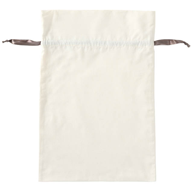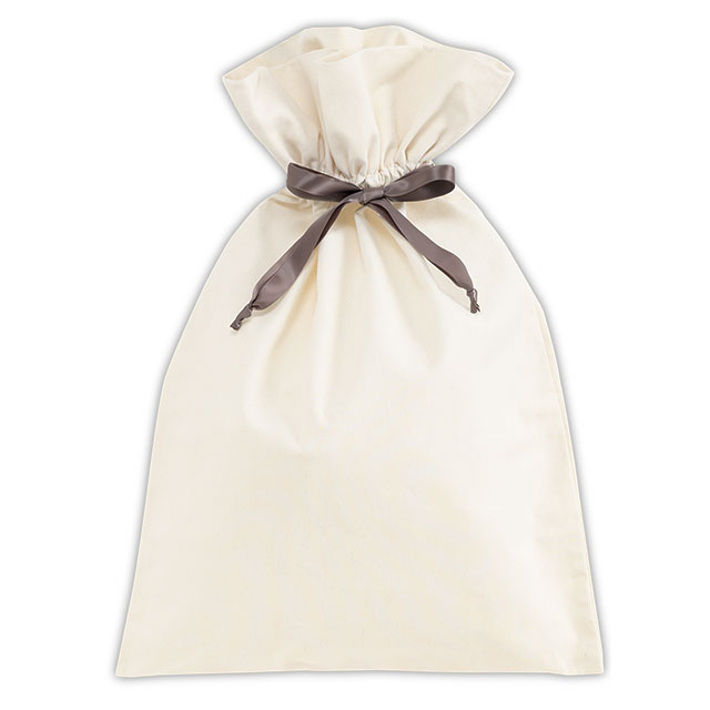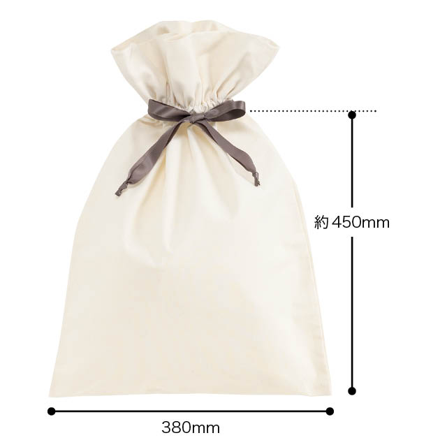 綿のナチュラルな素材感を活かしたコットンのような布製のリボン付巾着バッグです。グレーのサテンリボンでアクセントを添えて上品な雰囲気に仕上げました。リボンを結ぶだけで簡単で華やかなギフト包装が完成し、時短アイテムとして繁忙期にも大活躍。通年ギフトはもちろん、ギフトタグを添えれば、クリスマスや母の日、父の日など、季節やイベントの特別なギフトとして幅広くお使いいただけるラッピング袋です。