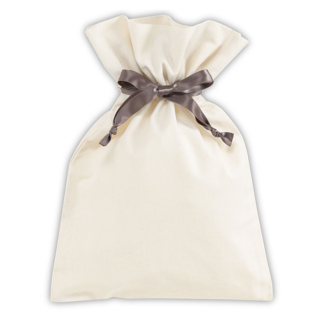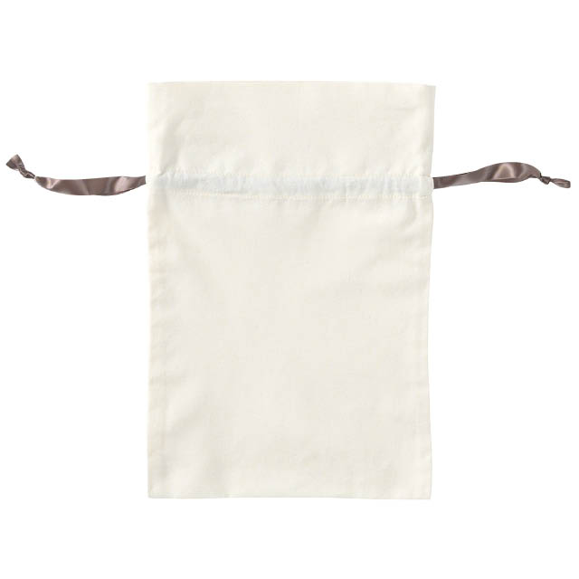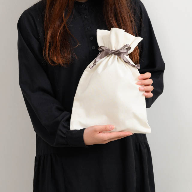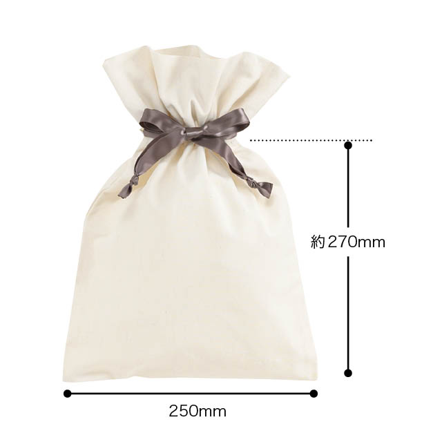 綿のナチュラルな素材感を活かしたコットンのような布製のリボン付巾着バッグです。グレーのサテンリボンでアクセントを添えて上品な雰囲気に仕上げました。リボンを結ぶだけで簡単で華やかなギフト包装が完成し、時短アイテムとして繁忙期にも大活躍。通年ギフトはもちろん、ギフトタグを添えれば、クリスマスや母の日、父の日など、季節やイベントの特別なギフトとして幅広くお使いいただけるラッピング袋です。