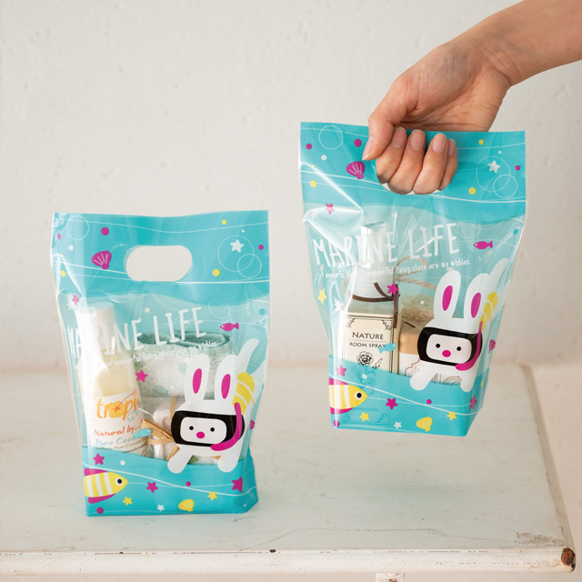 鮮やかな水色で海をイメージした夏らしいデザインのスタンドバッグです。かわいいうさぎのイラストが子どもに喜ばれます。自立して立たせることができるのでディスプレイしやすく、店頭映えします。