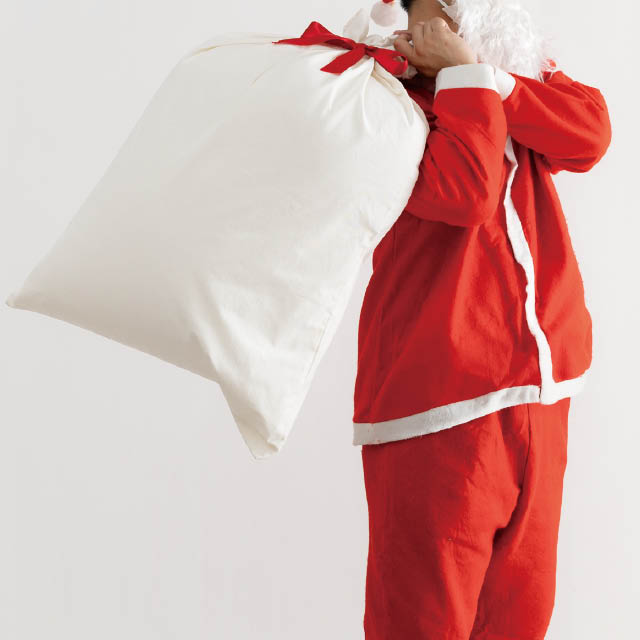 クリスマスシーズンのギフトラッピングはもちろん、店舗ディスプレイやイベント装飾アイテムにも活躍。インパクトと実用性を兼ね備えた大きな白の巾着袋で、お客様の“特別な贈り物”シーンを演出します。